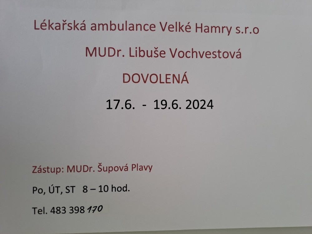 Dovolená MUDr. Vochvestová