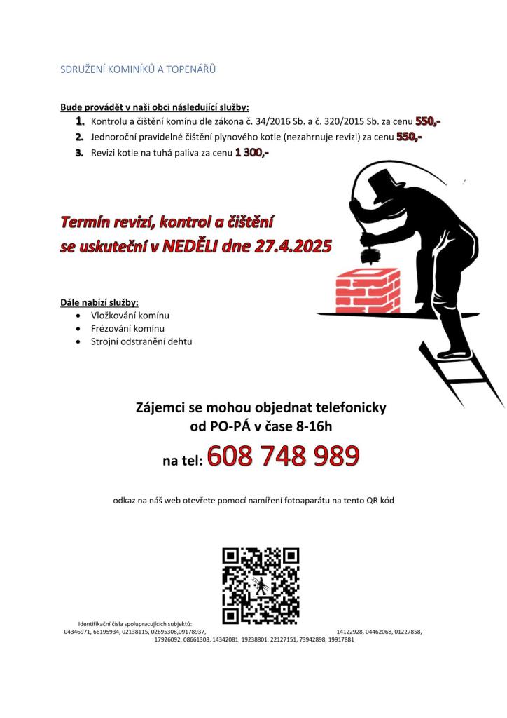 Dne 27.4. bude provádět v naší obci požadované kontroly a čištění komínů a kotlů.