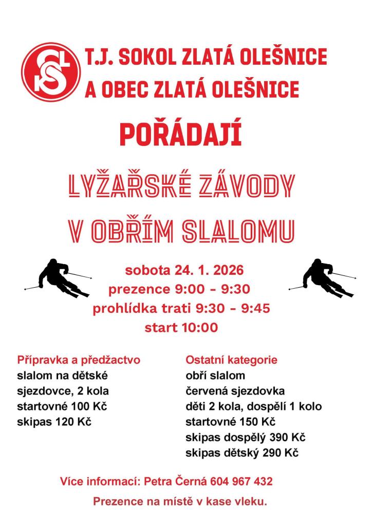 TJ Sokol Zlatá Olešnice a obec Zlatá Olešnice vás zvou na lyžařské závody v obřím slalomu, které se konají v sobotu 24. ledna 2026. Prezence probíhá od 9:00 do 9:30, následovat bude prohlídka trati od 9:30 do 9:45. Samotný závod začíná v 10:00. Závody jsou určeny pro přípravku, předžactvo a ostatní kategorie. Všichni závodníci se mohou těšit na slalom na dětské obří slalomové sjezdovce, a to ve dvou kolech pro děti a jednom pro dospělé. Přijďte si užít den plný sportu a zábavy.